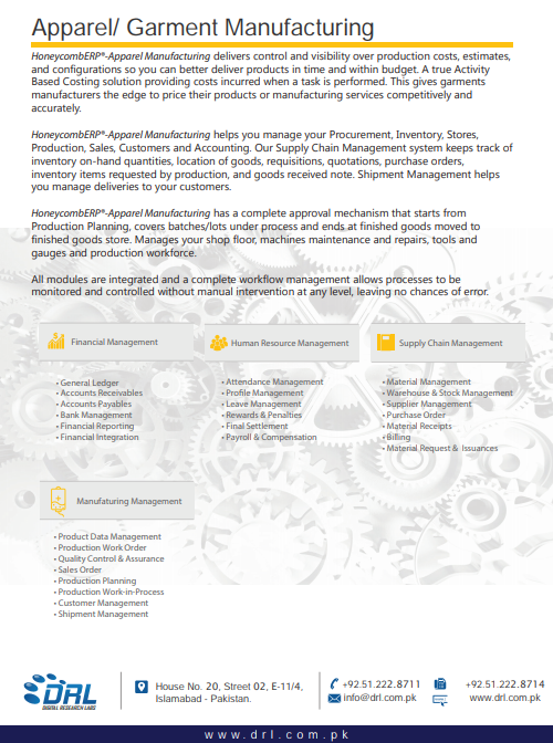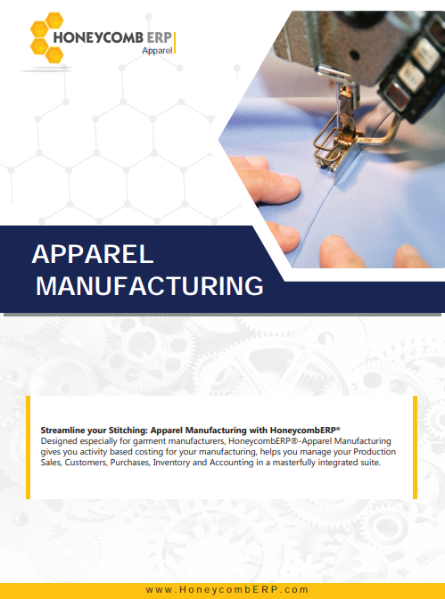 Designed especially for garment manufacturers, HoneycombERP®-Apparel Manufacturing gives you activity based costing for your manufacturing,helps youmanage your Production Sales, Customers, Purchases, Inventory and Accounting in a masterfully integrated suite.