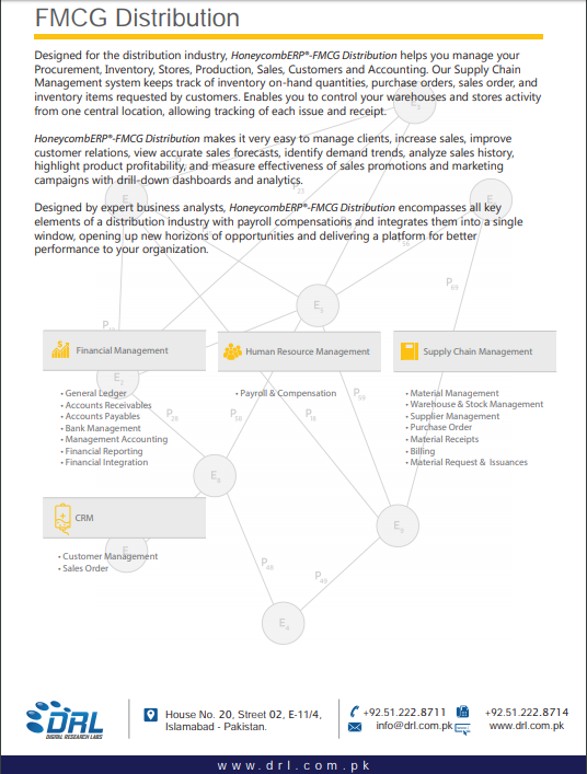 Designed for the distribution industry, HoneycombERP®-FMCG Distribution helps you manage your Procurement, Inventory, Stores, Production, Sales, Customers and Accounting. Our Supply Chain Management system keeps track of inventory on-hand quantities, purchase orders, sales order, and inventory items requested by customers. Enables you to control your warehouses and stores activity from one central location, allowing tracking of each issue and receipt.